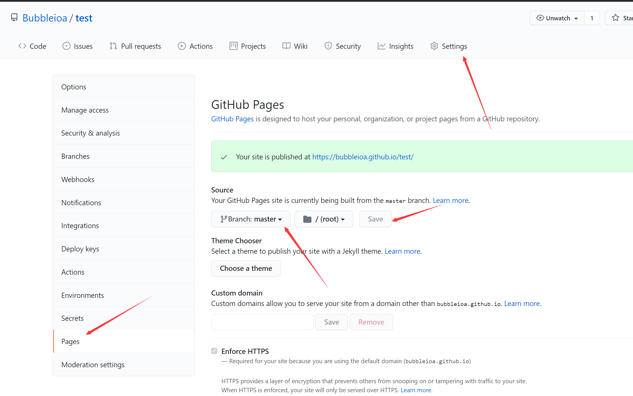 找到 Pages,选择 master 分支,保存即可。