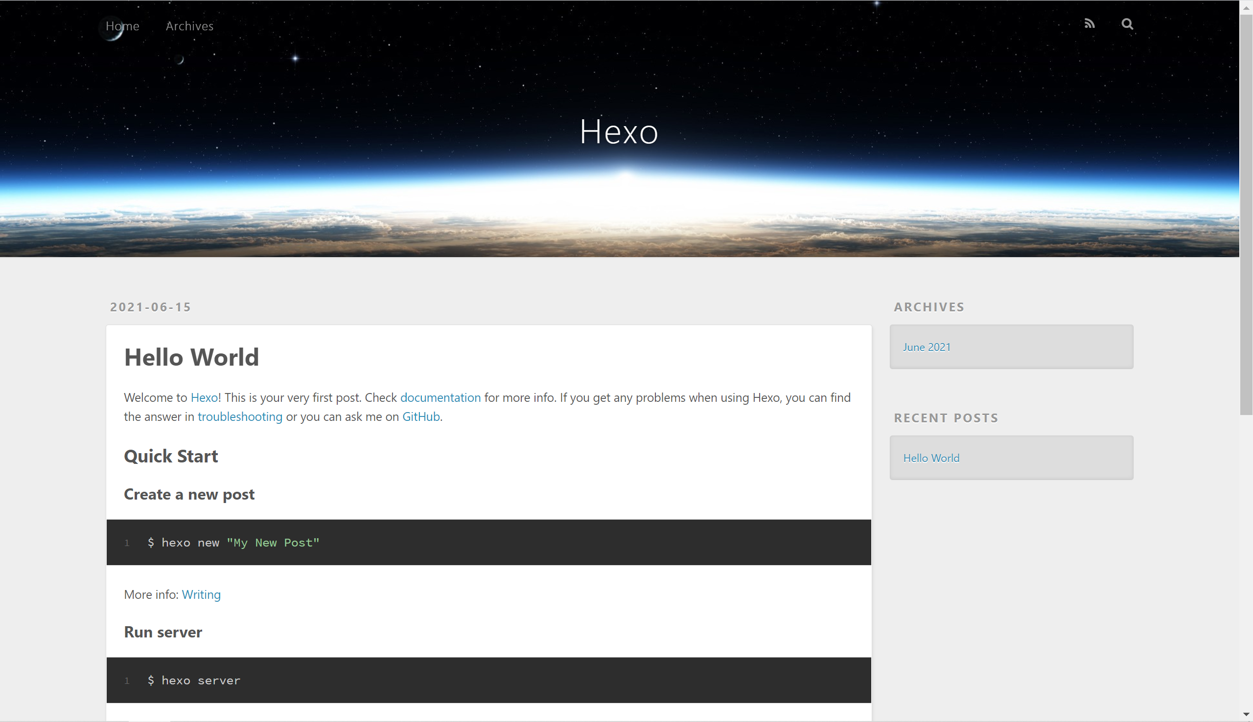 >cd ioa_blog >npm install >hexo server INFO Validating config INFO Start processing INFO Hexo is running at http://localhost:4000 . Press Ctrl+C to stop. |