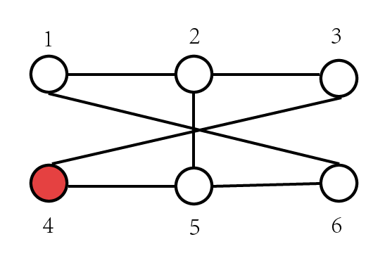 假设我们要更新4这个点,我们发现其余5个点都有到它的合法路径,如果我们用5更新4的话,会发现5状态也会需要4来更新,我更新我自己是不可以的。